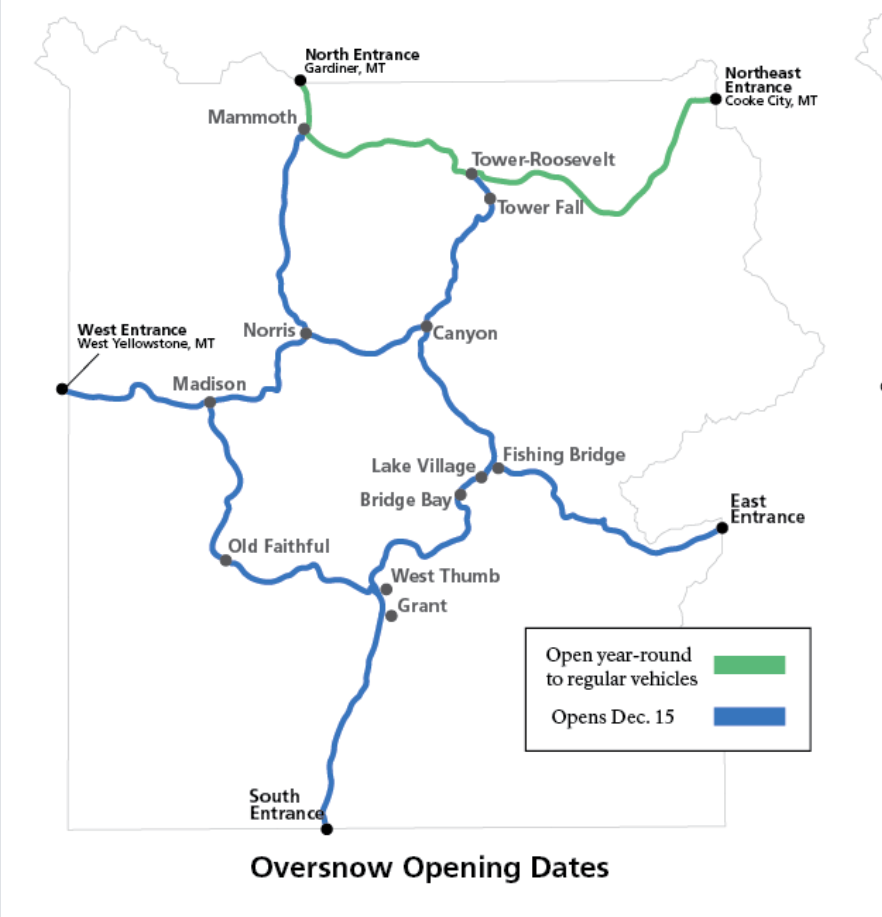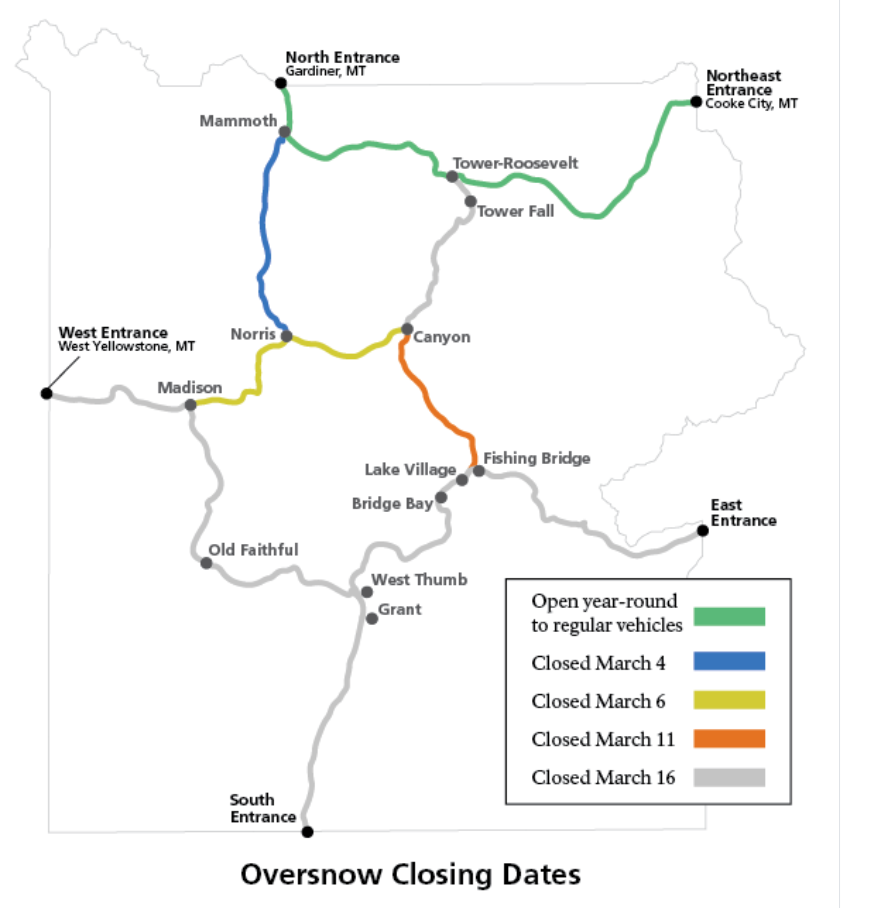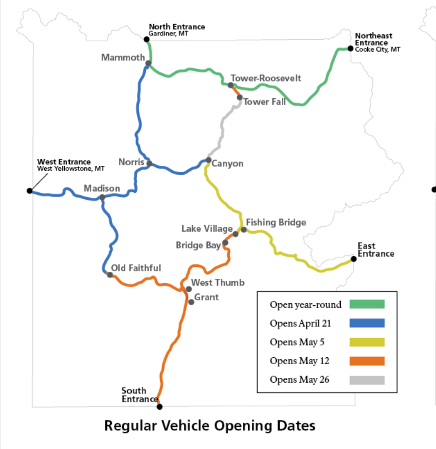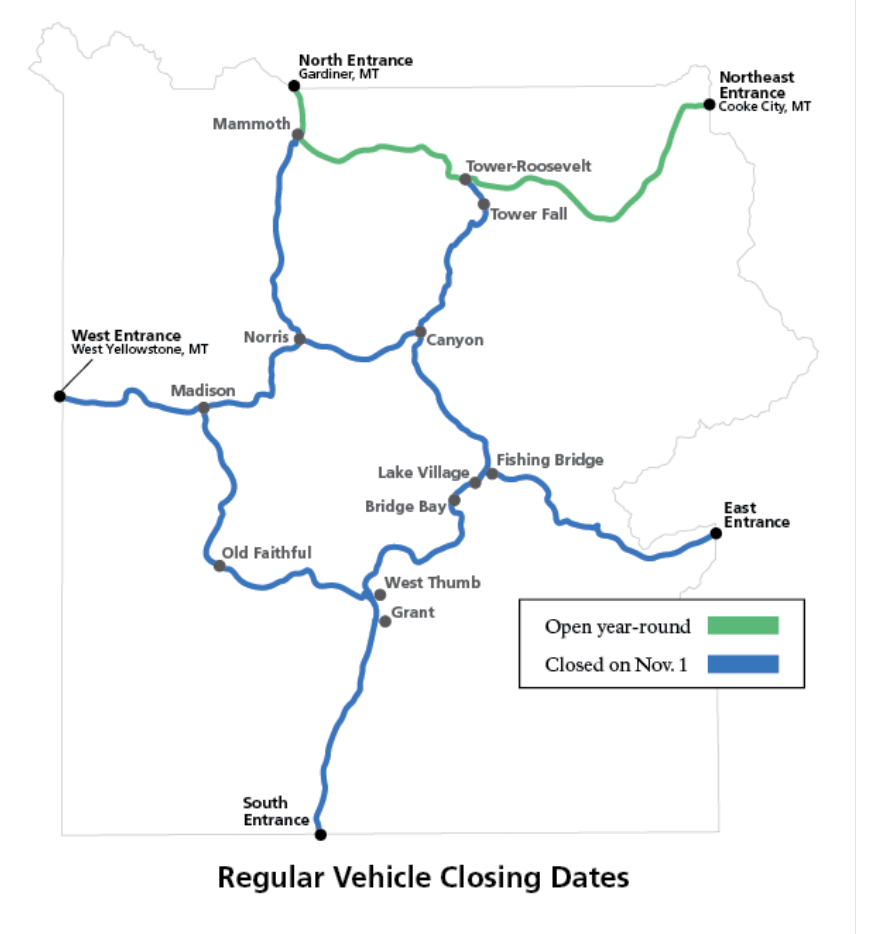 The road from Gardiner, MT to Mammoth Hot Springs and along the northern range to Cooke City, MT is open year-round. While the roads to the interior of the park i.e., Old Faithful and Canyon have seasonal closures in place.